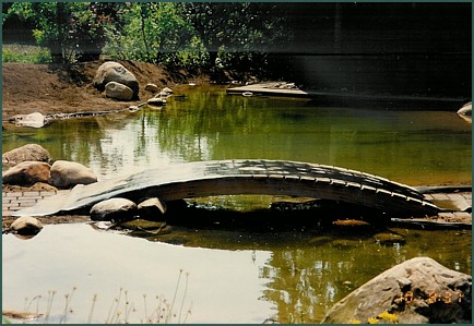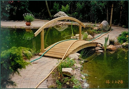 Verfolgen Sie den Bau einer Gartenbrücke über einem Teich.